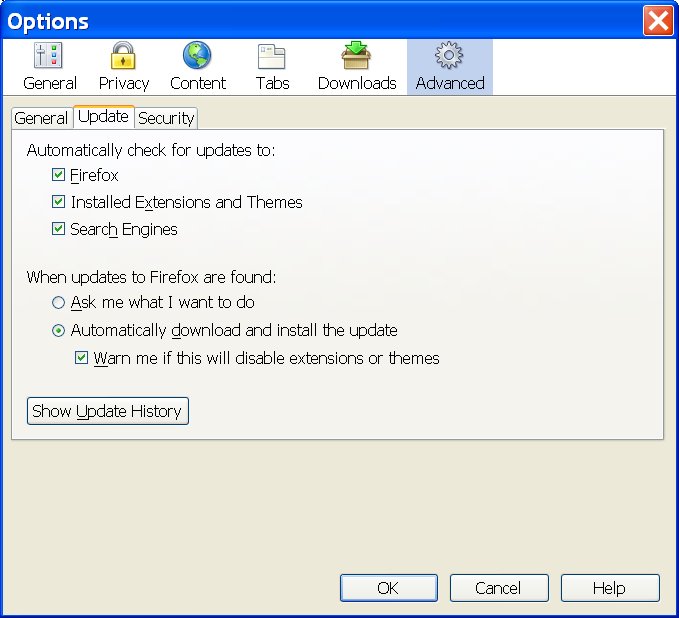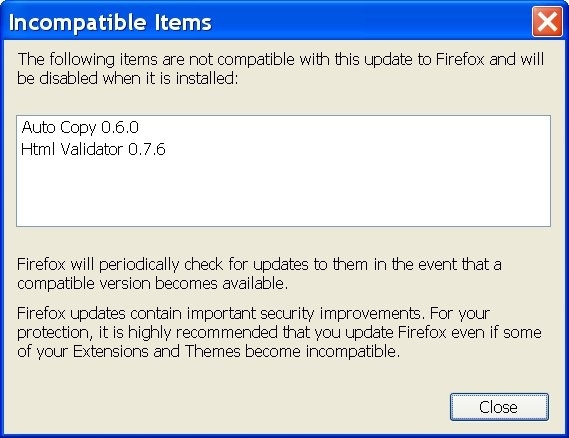 The Firefox 1.5 developers did a great job of addressing the problem of extensions disabled unexpectedly by a browser upgrade. The automatic update feature in Firefox 1.5 effectively alerts users to the potential loss of functionality when updating their browser.
